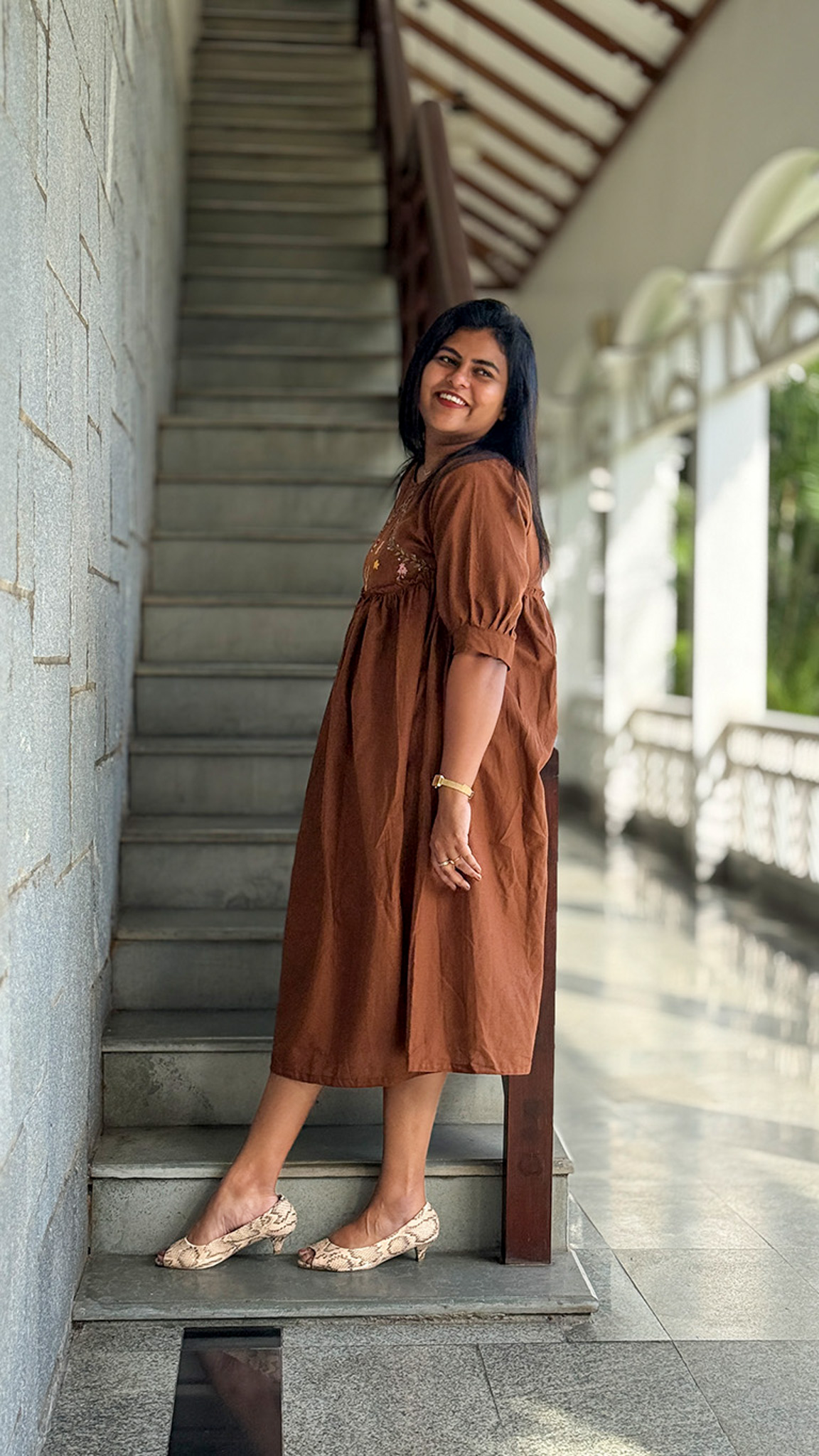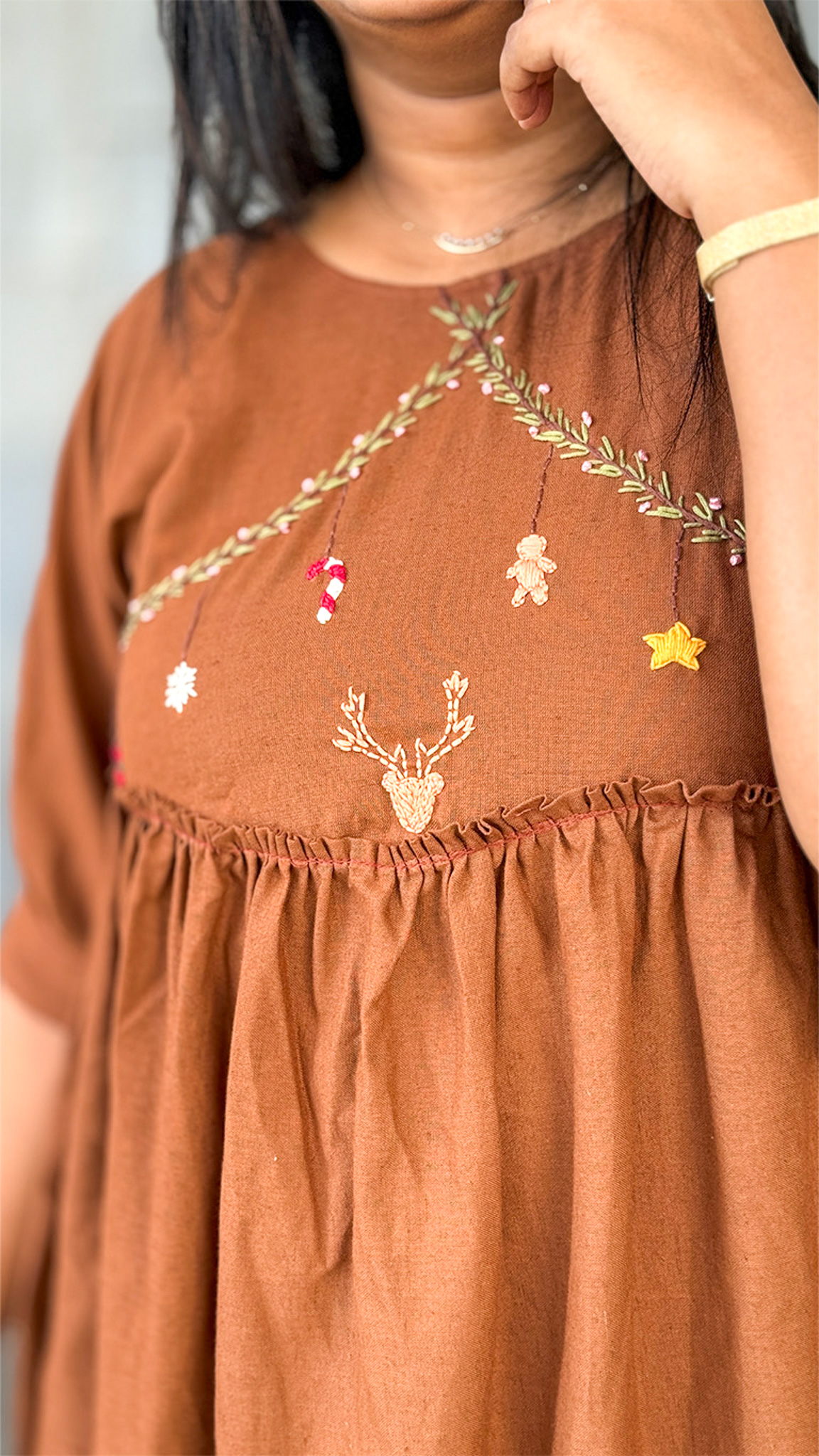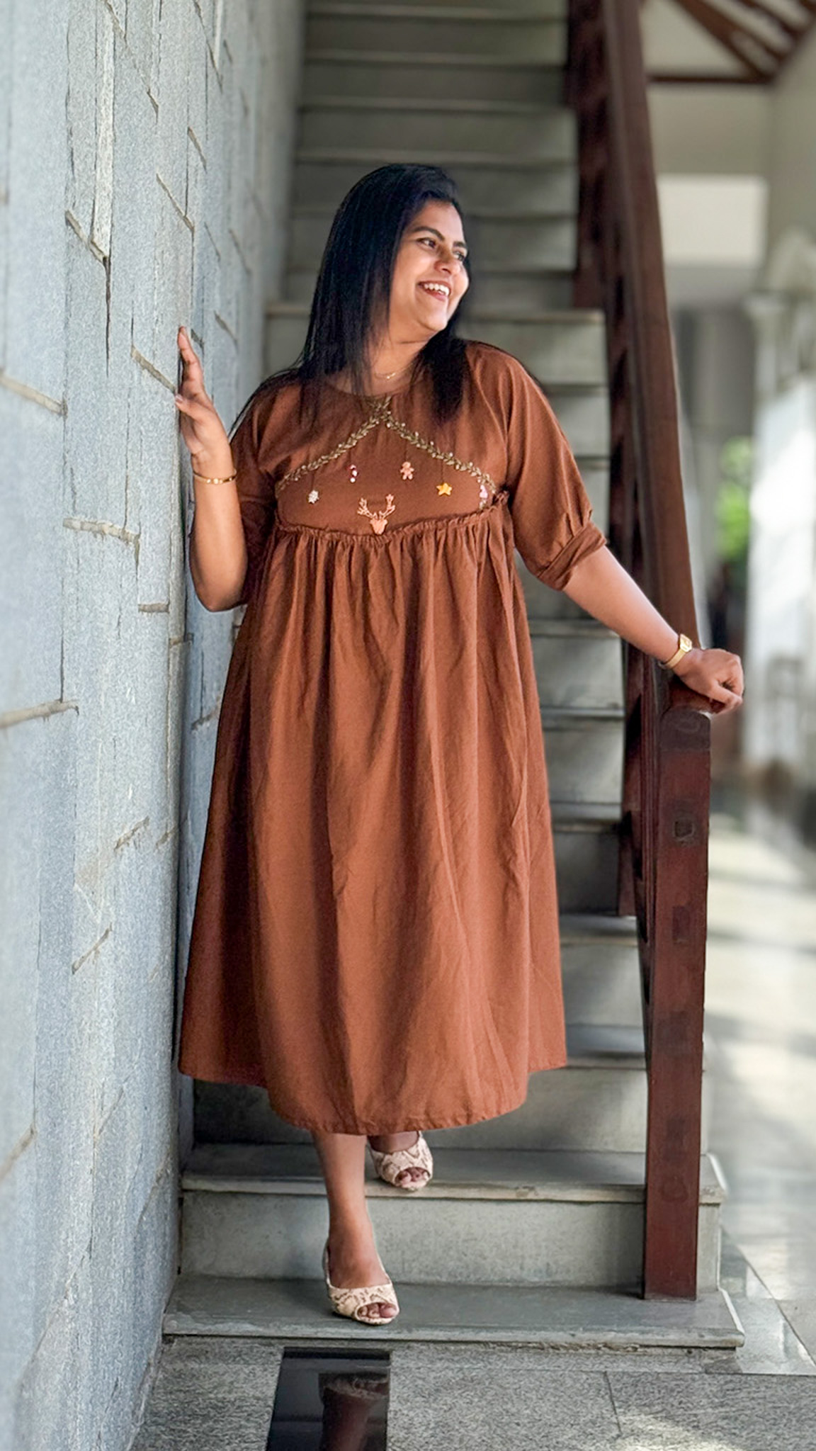 Wrap yourself in the warmth of the season with this caramel-brown cotton dress. Featuring charming Christmas deer and décor embroidery, this piece captures the cozy essence of the holidays. Its relaxed fit, gathered waistline, and soft fabric make it your go-to for effortless elegance and festive joy.