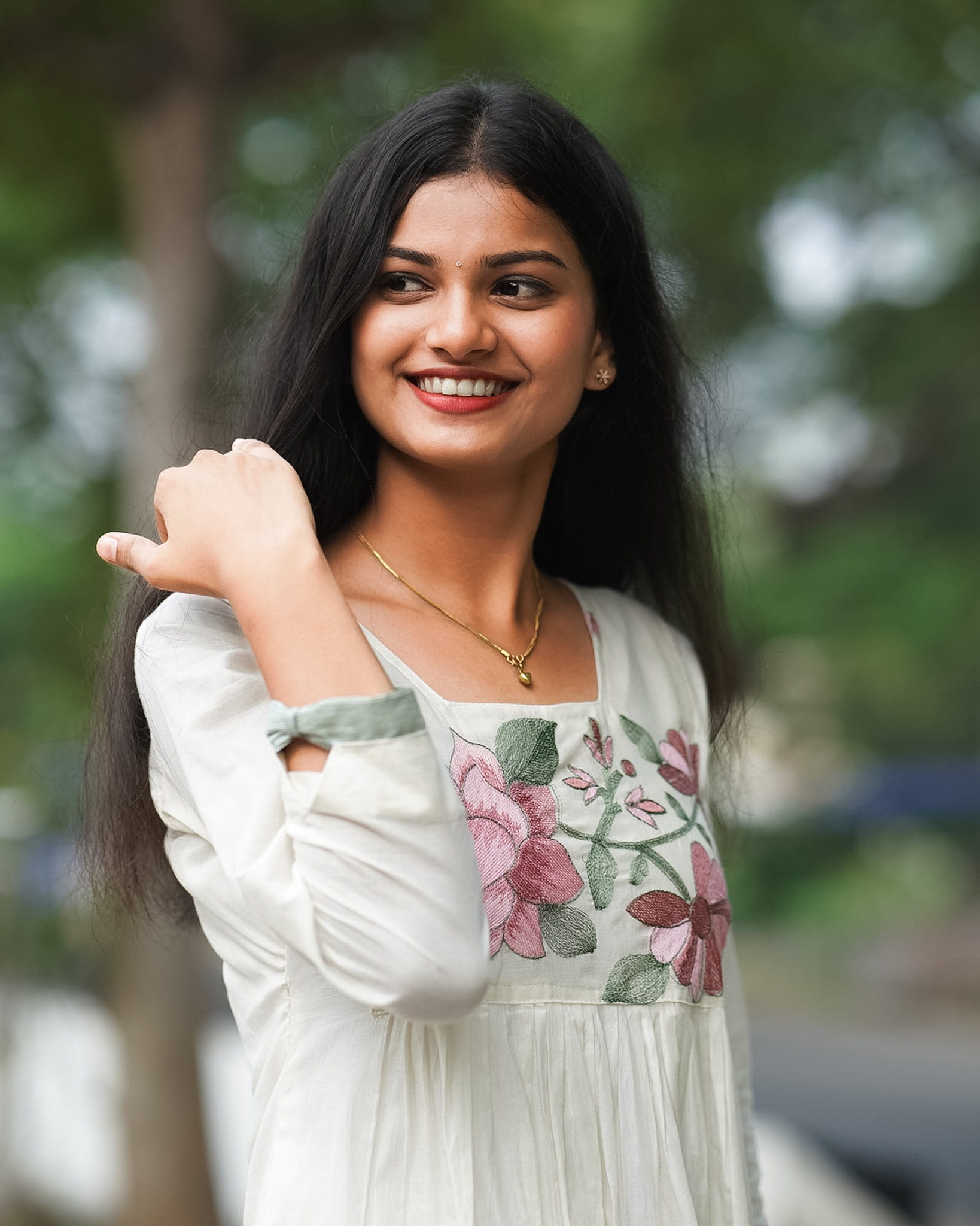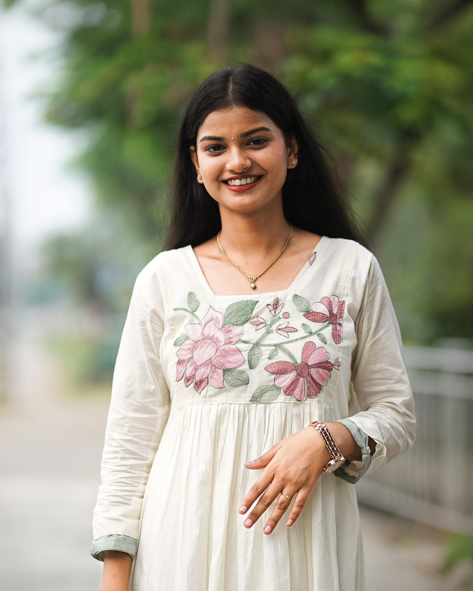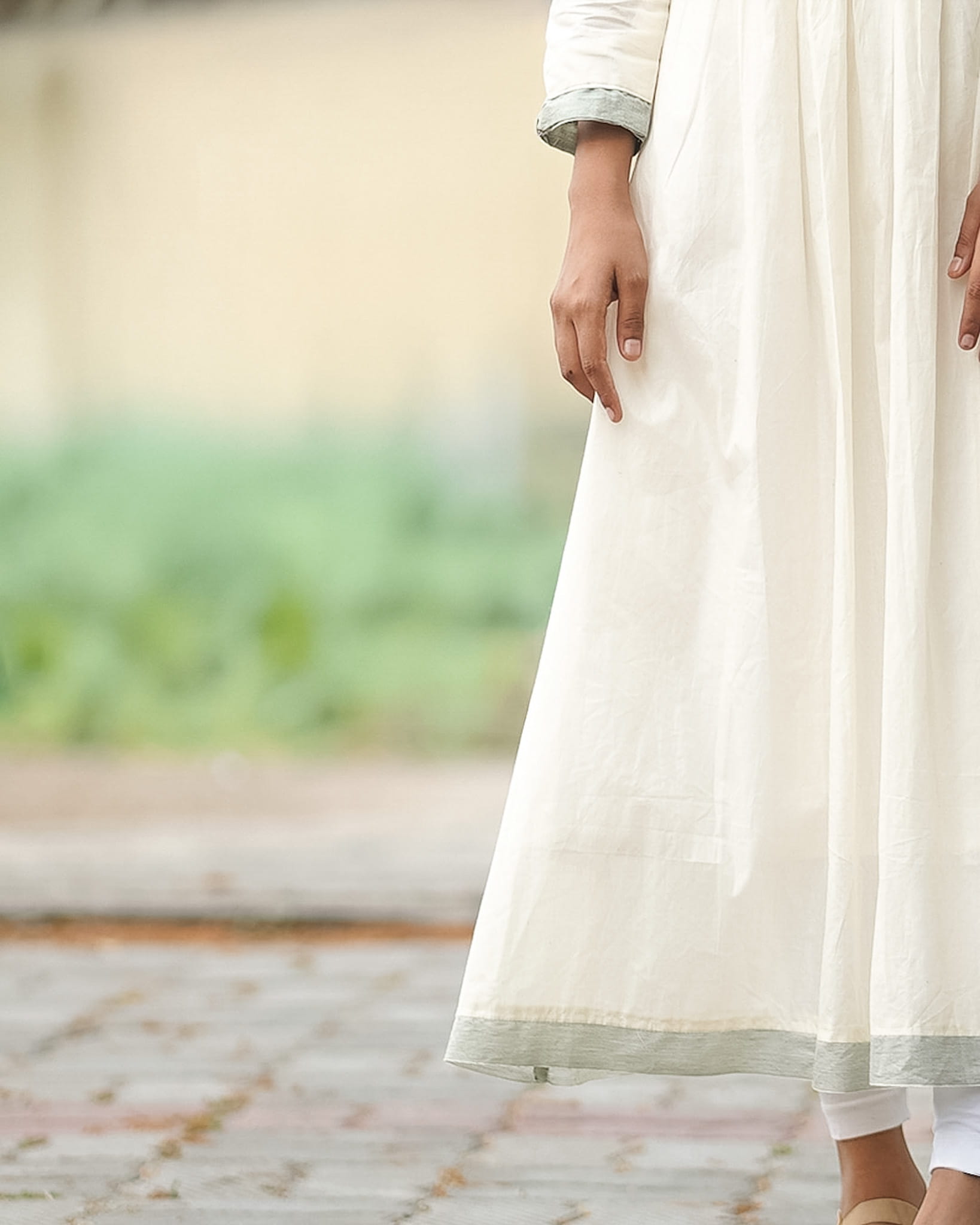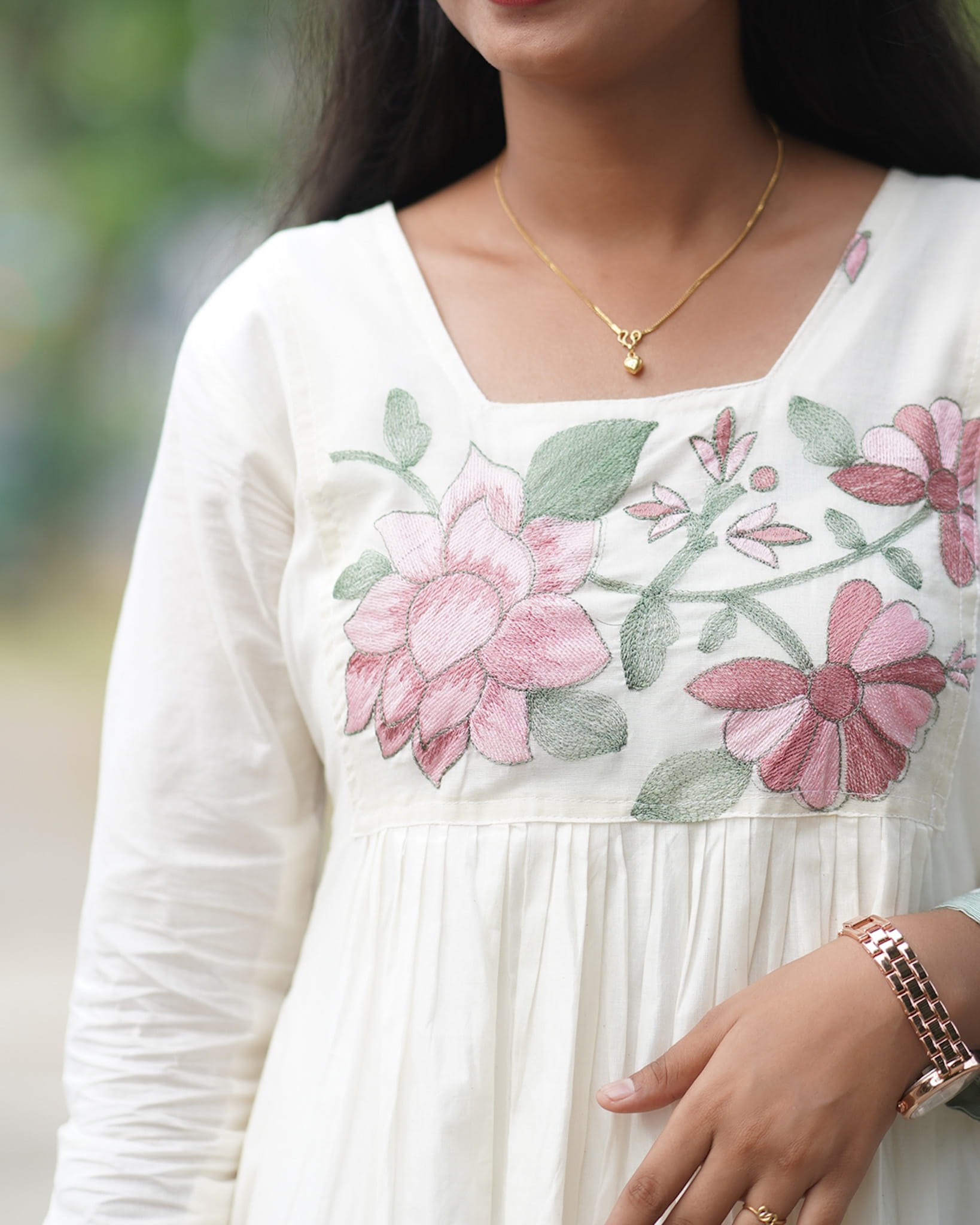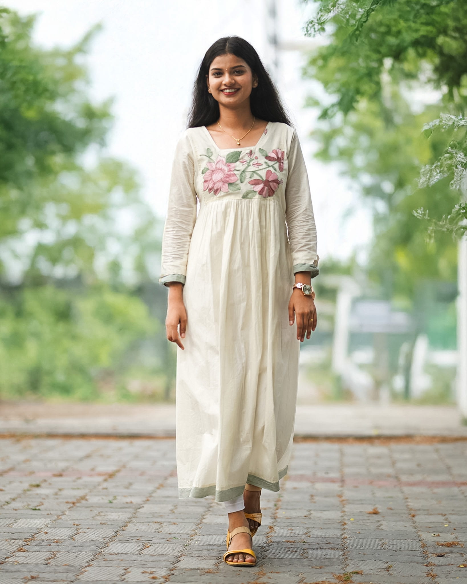 Graceful and artistic, this kurti features delicate lotus embroidery that adds a serene and nature-inspired charm. Stylish sleeves complement the A-line silhouette, rendering a modern yet elegant appeal. Designed with a striped green border and a custom border in matching leaf tones, the outfit highlights subtle craftsmanship. The inner lining ensures comfort and structure, making it suitable for both festive and semi-formal occasions