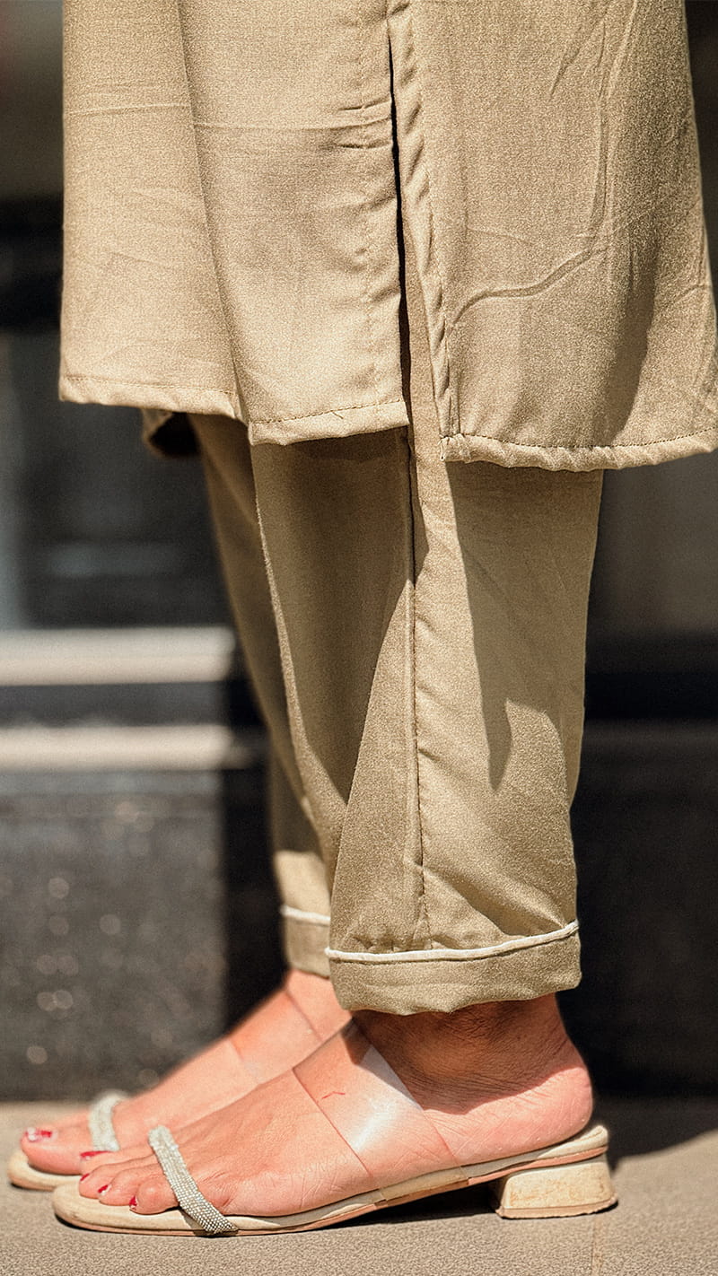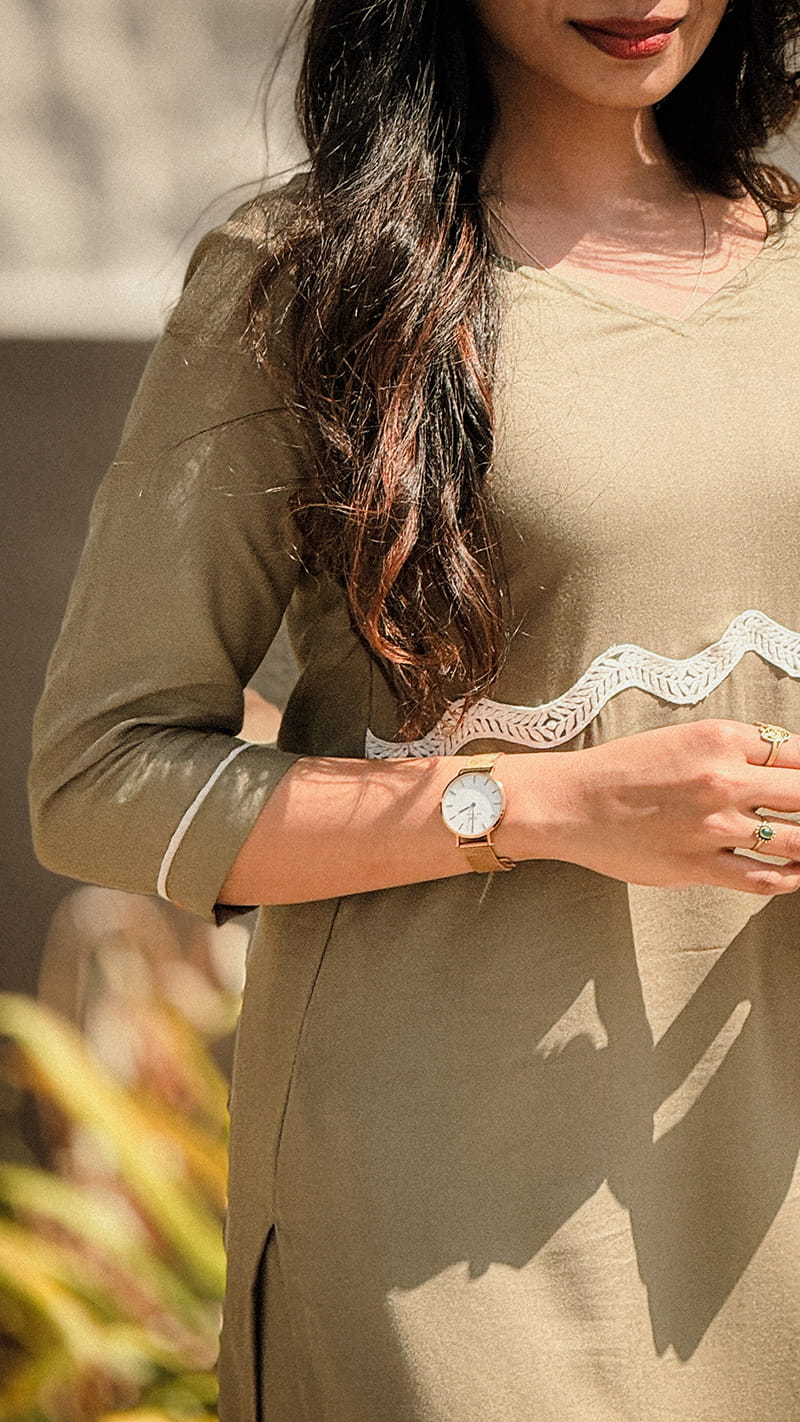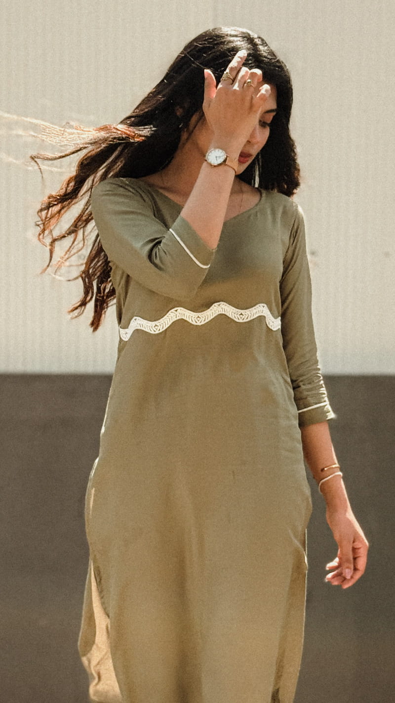 Minimal, modern, and effortlessly elegant this olive green co-ord set is designed for everyday sophistication. The kurti features a flattering V-neckline and three-quarter sleeves, highlighted with a delicate lace panel across the bodice that adds subtle texture and charm. Paired with matching straight-fit pants, this coordinated set offers a clean silhouette that transitions beautifully from workwear to casual outings. Comfortable yet refined, it’s a wardrobe essential for women who love understated style.