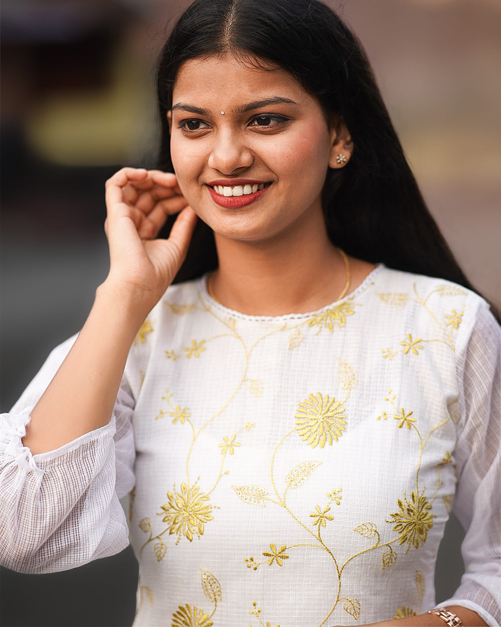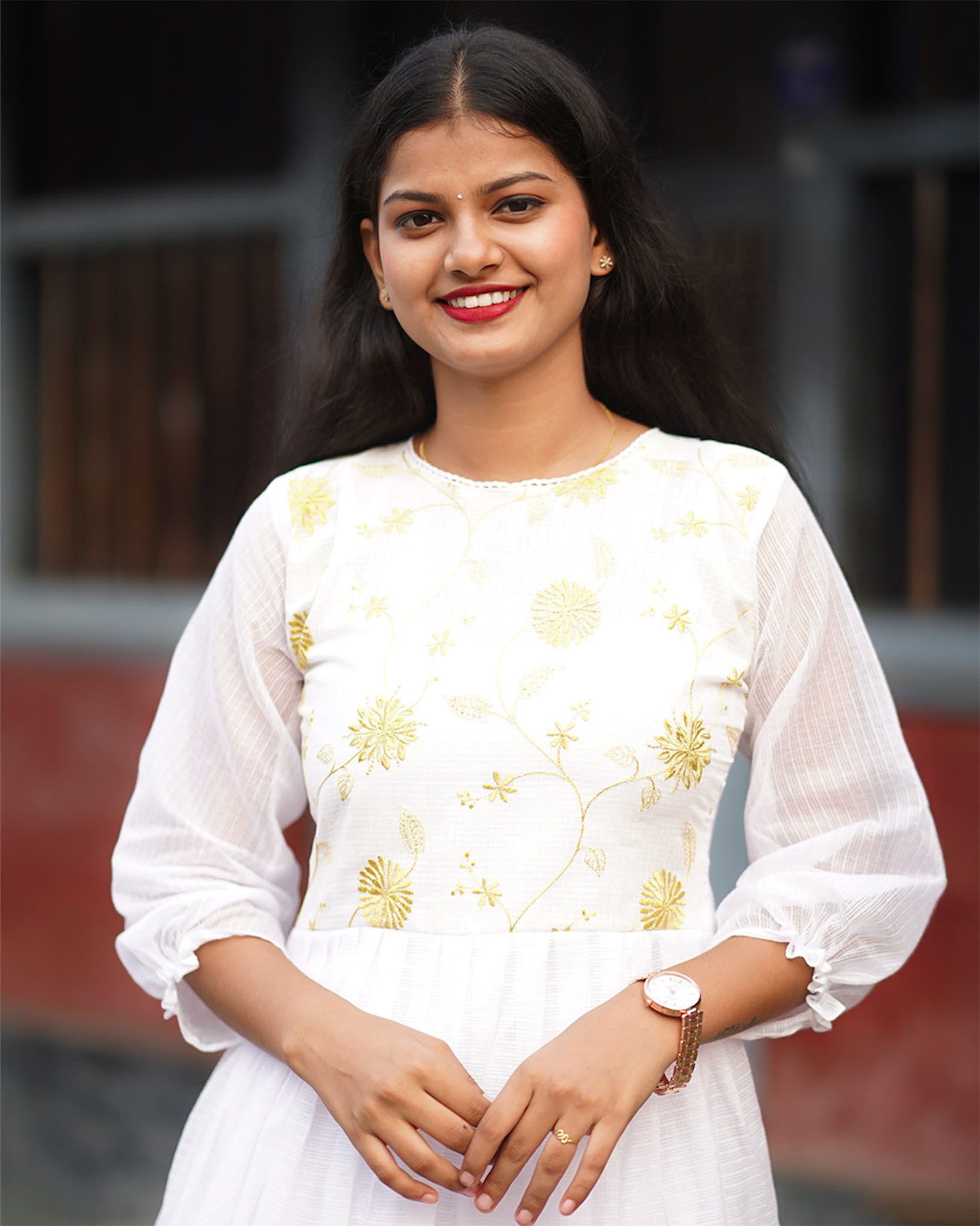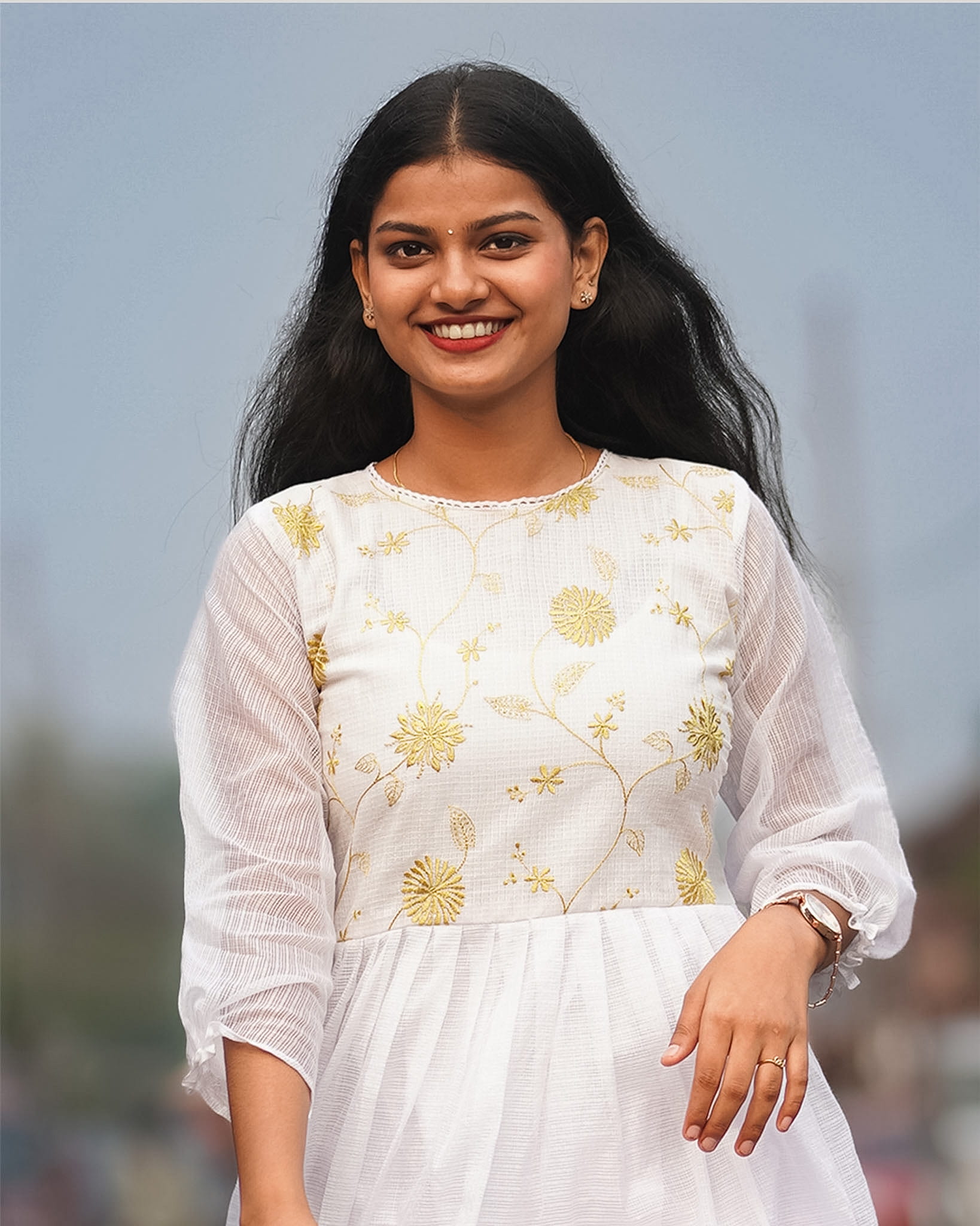 Soft, graceful, and delicately detailed, this white and yellow dress or kurti features a beautifully machine-embroidered yoke that adds a refined artistic touch. The A-line silhouette flows gently with pleats along the skirt area, creating an elegant and flattering shape. With comfortable lining and subtle lace detailing around the neckline, the design blends sophistication with everyday comfort. Ideal for festive mornings, casual celebrations, and elegant daywear.